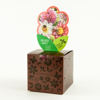 Twee biologische Dahliaknollen zitten er in deze leuke geschenkverpakking. Voor bijen en vlinders.