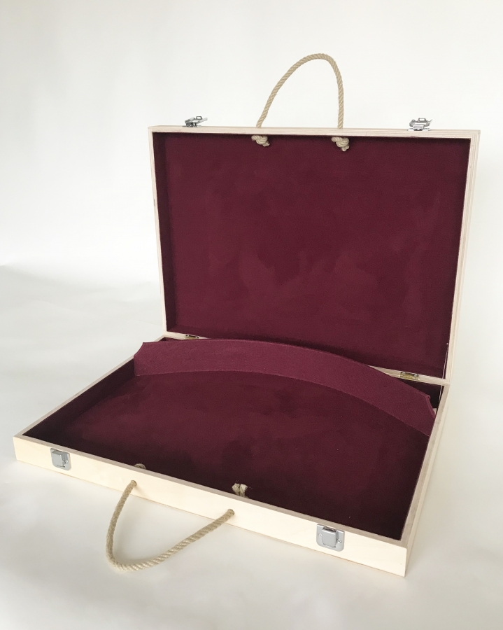 De koffer is gemaakt van berkenhout en bekleed met kunstvilt, ter bescherming van de lak van de lier.